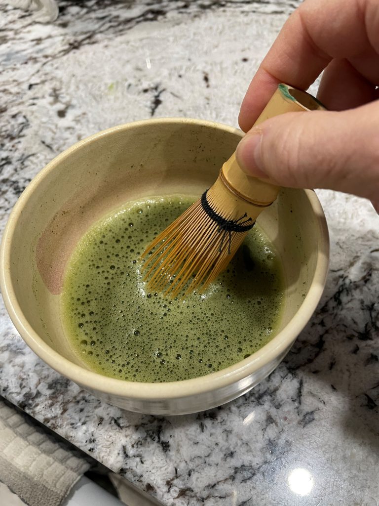 To make a smooth, clump-free, frothy matcha tea, I suggest you get yourself a traditional bamboo whisk and tea bowl (chawan) for best results. I mix about ½ tsp of matcha tea powder with 2 to 3 ounces of water in a cup or bowl, and whisk until smooth and frothy. I use an ‘M-shaped’ movement across my bowl with the whisk – not a circular pattern.